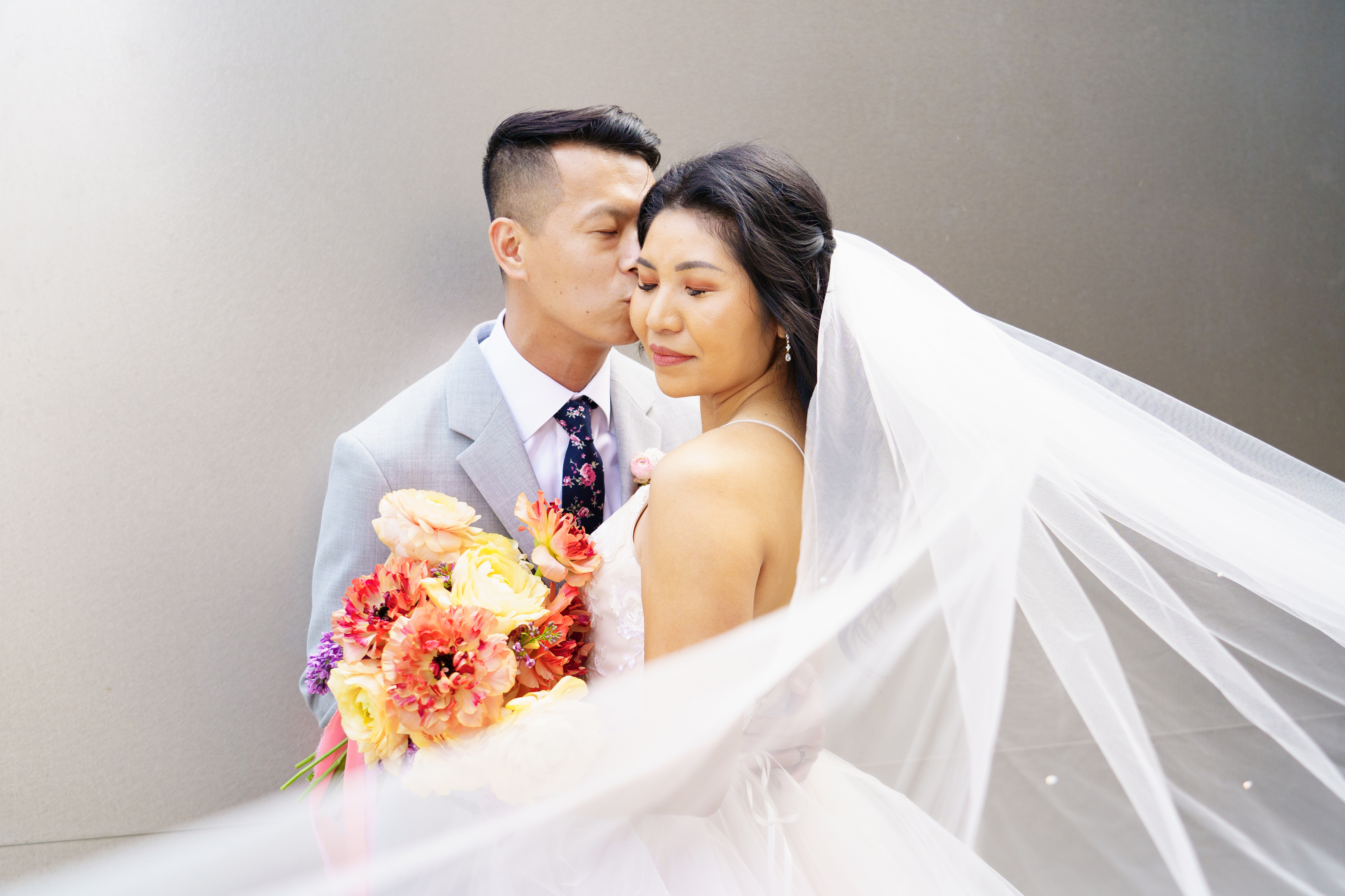 We have been trying to schedule a newlywed session with Michelle and John for ages but due to all kinds of scheduling issues (and covid, sigh) it has taken us a while! These two got married for the first time in a micro wedding in 2020, celebrated with all their friends and family at their original venue last year and in February we finally met up with them at the Walt Disney Concert Hall for some last magical shots in their wedding best! We added some colorful flowers by the incredible Urban Marigold, and had a wonderful time exploring this beautiful spot together. Congratulations to these two lovely humans!